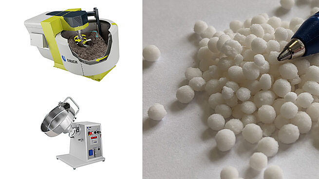 But in the past, build-up agglomeration was not an expedient solution when it came to agglomerating salts. Eirich has now developed a method using a feed of superheated steam to achieve high-strength granulates – of more than 30 N – using a combination of a mixer and a disk pelletizer. The method requires far less energy input than the use of crystallizers, and another advantage it offers is that further substances can be added at the build-up agglomeration stage and incorporated into the granules.